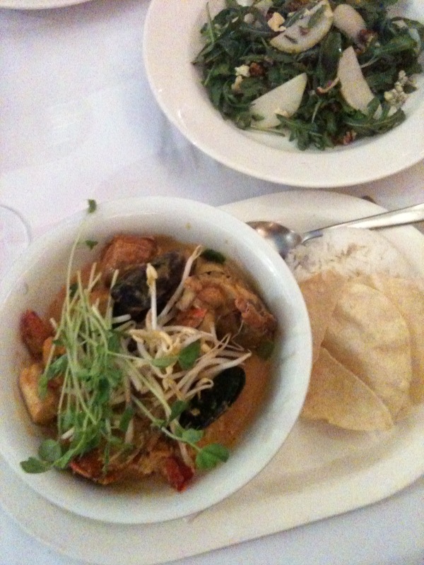 Tonight Andrew and I decided to dine at our favourite restaurant in Mooloolaba, Hot Pippis. Once was not enough; we were both craving a steak our first night in town and we were not disappointed with the fillet steak. I was familiar with the Seafood Curry, Hot Pippis Signature dish as I have had it on two previous visits. Tonight I was once again lucky to taste this most delicious dish. The curry is Thai influenced with coconut milk, peanut and just the right amount of spice. Moreton bay bugs, local prawns, scallops, mussels, snapper and a bit of squid. Culinary bliss point! I highly recommend it.