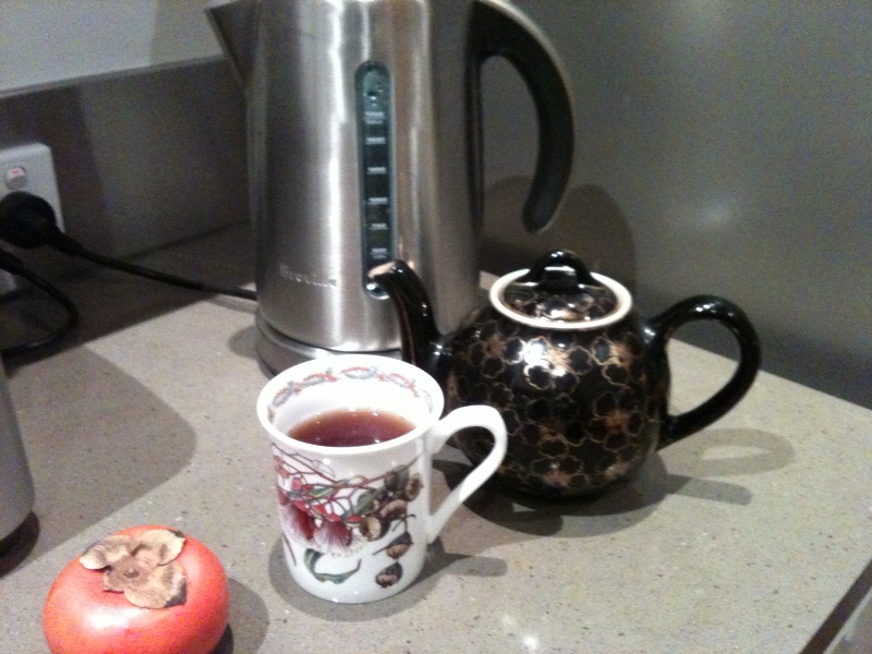 My mother’s old tea pot, my Australian native plant series china tea cup, my new kettle with different heat settings for various beverages and persimmons which are in season at the moment. Oh, and autumn weather!
