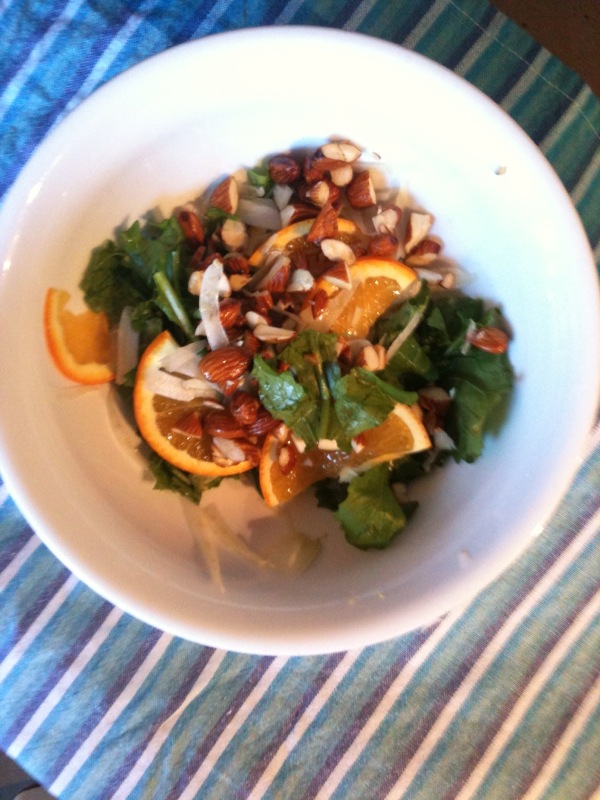 Rocket (Arugula to my North American readers) grows in my garden in winter. So, inspired by Amanda Daniel from 2bEthical who made a winter salad at the Adelaide Showgrounds Farmer’s Market demo kitchen, I did a version of my own. All local produce including the olive oil that I used to warm the local almonds with. Gotta love the Mediterranean climate here in Adelaide. Yummy salad.