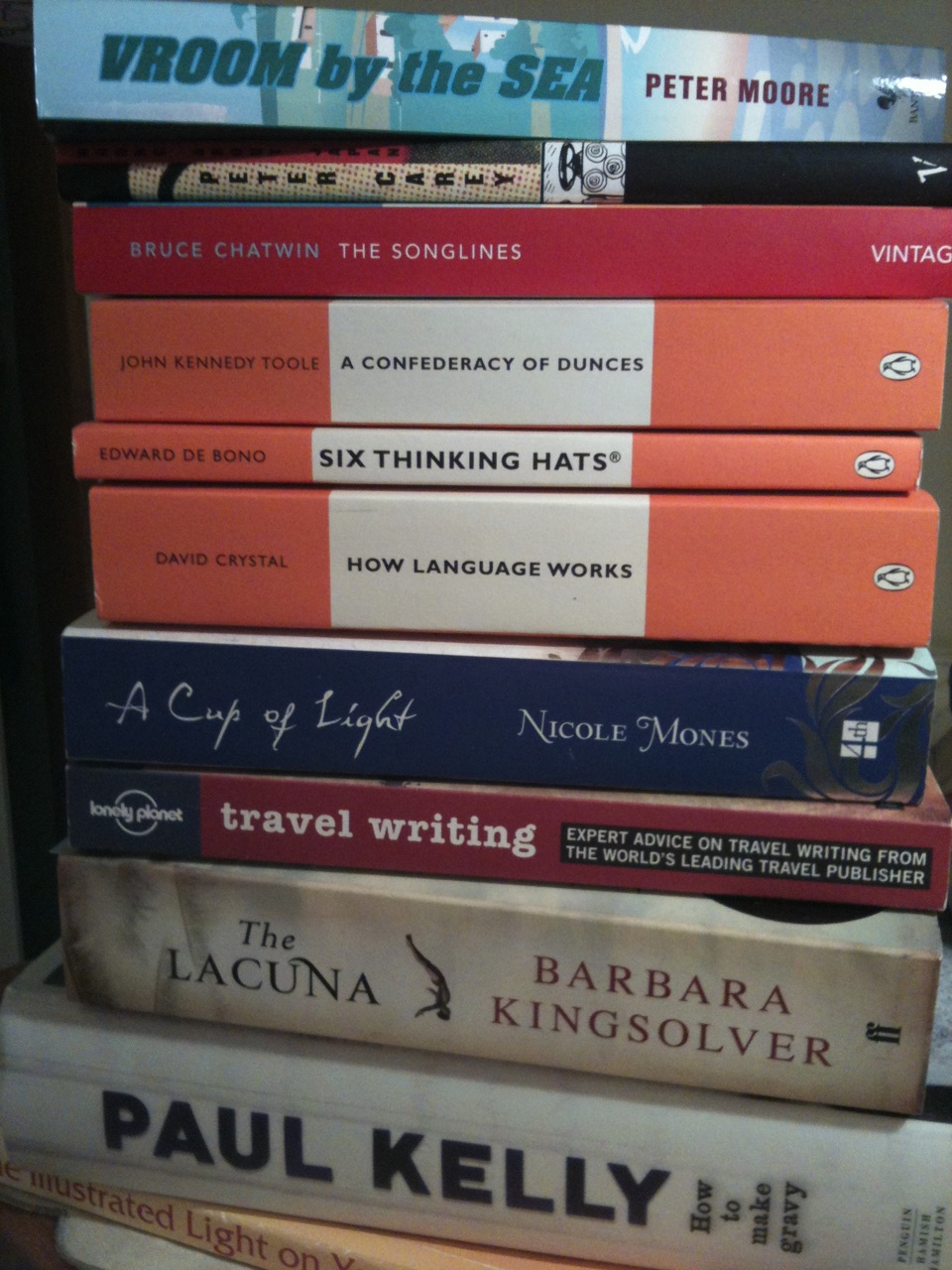 Some I re-read, like The Phantom Tollbooth. Two are unfinished, The Songlines and The Sea. I put them aside when heading overseas and concentrated on my Lonely Planet Italy Guide and my notebooks for my classes while studying Italian. I took the dog-eared Anatomy of Restlessness (compilation of Bruce Chatwin stories, reviews and articles) with me for flights. But I don’t really read much on holidays when I go away. Home holidays are better for that.