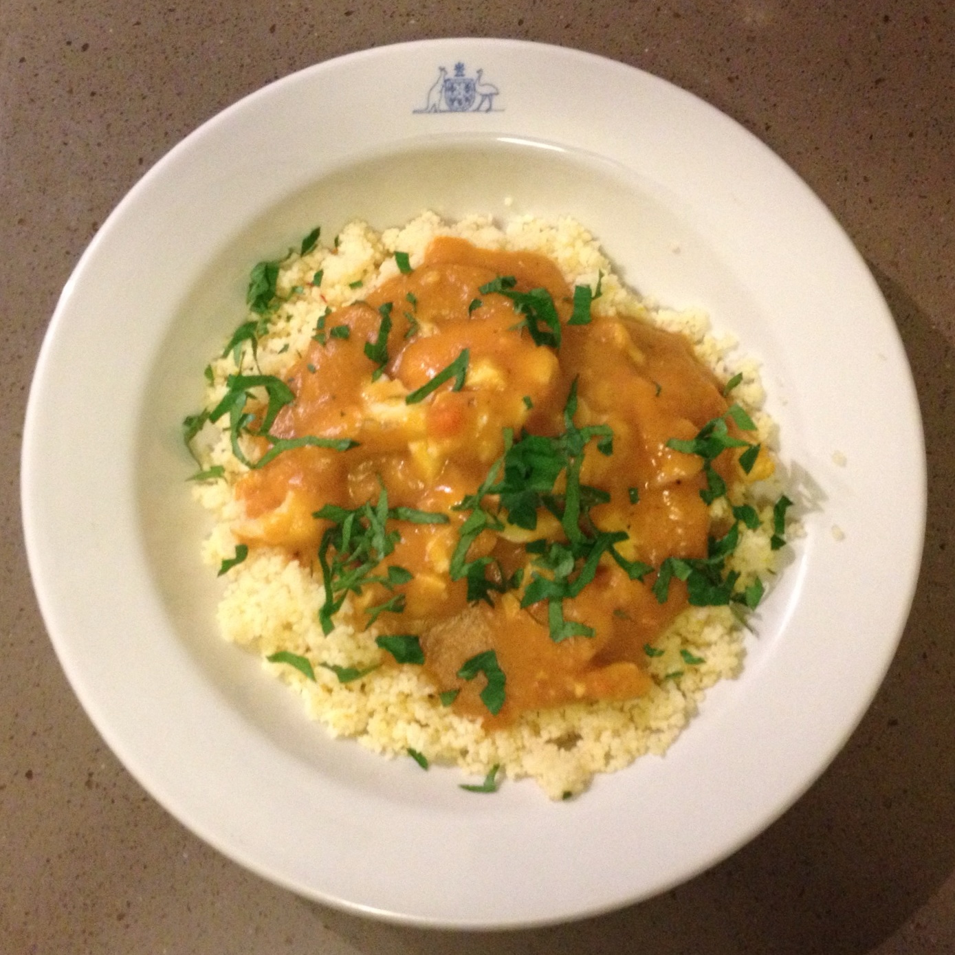 So we had some fillets of sea perch, the home-made spicy pumpkin and sweet potato soup with a few red lentils to thicken, in a base of home-made chicken stock, some couscous, flat leaf parsley from the garden and vegetables to steam. Husband Roo was a little sceptical. I am not the cook in the house usually. But occasionally I suggest something and let him run with it and improvise using his knowledge of techniques.