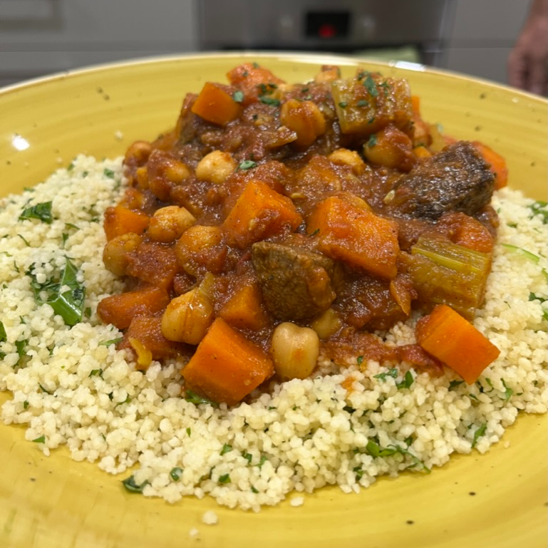 - Couscous topped with a beef, chickpea, carrot and celery stew.