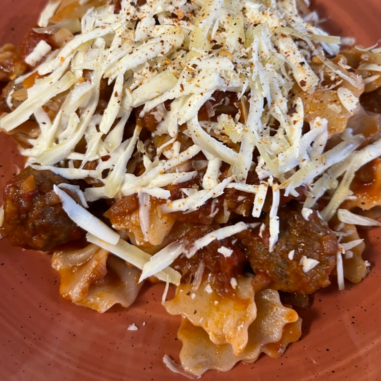 - Homemade farfalle pasta with ragu, topped with grated Ricotta Salata.