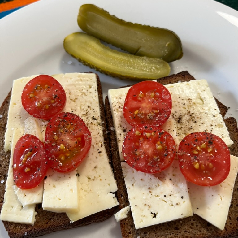 - Open sandwiches of Latvian rye, salted ricotta and homegrown tomatoes.