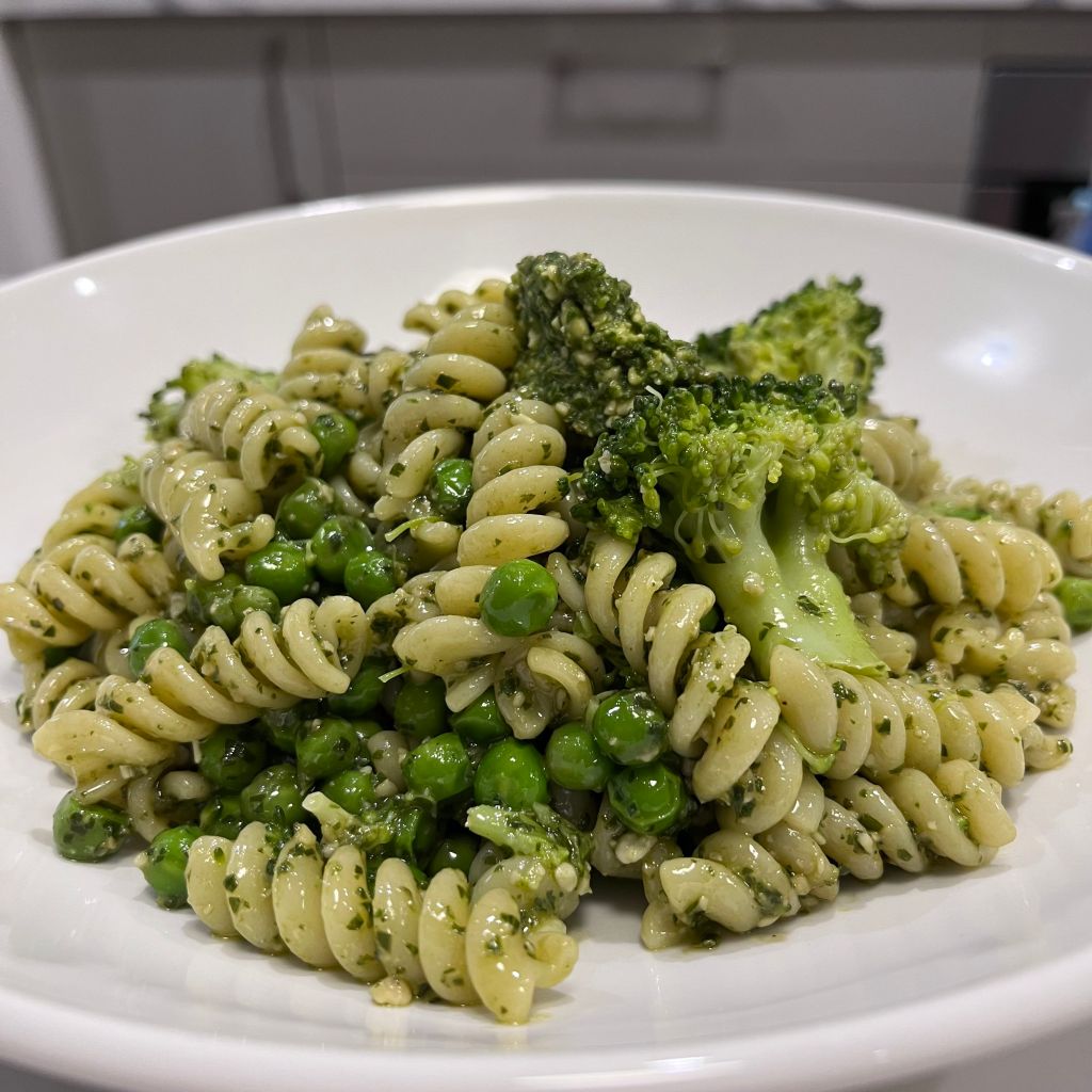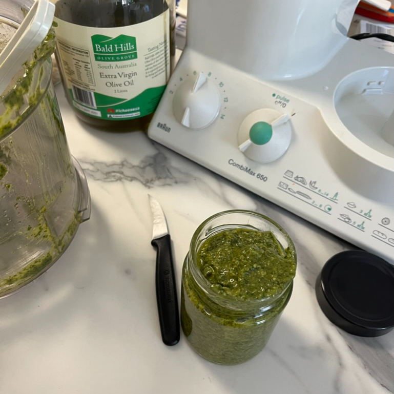 - Spaghetti with homemade Pesto Genovese (it’s summer in Australia; our garden has basil) tossed with pieces of chicken breast that we grilled on the Weber.